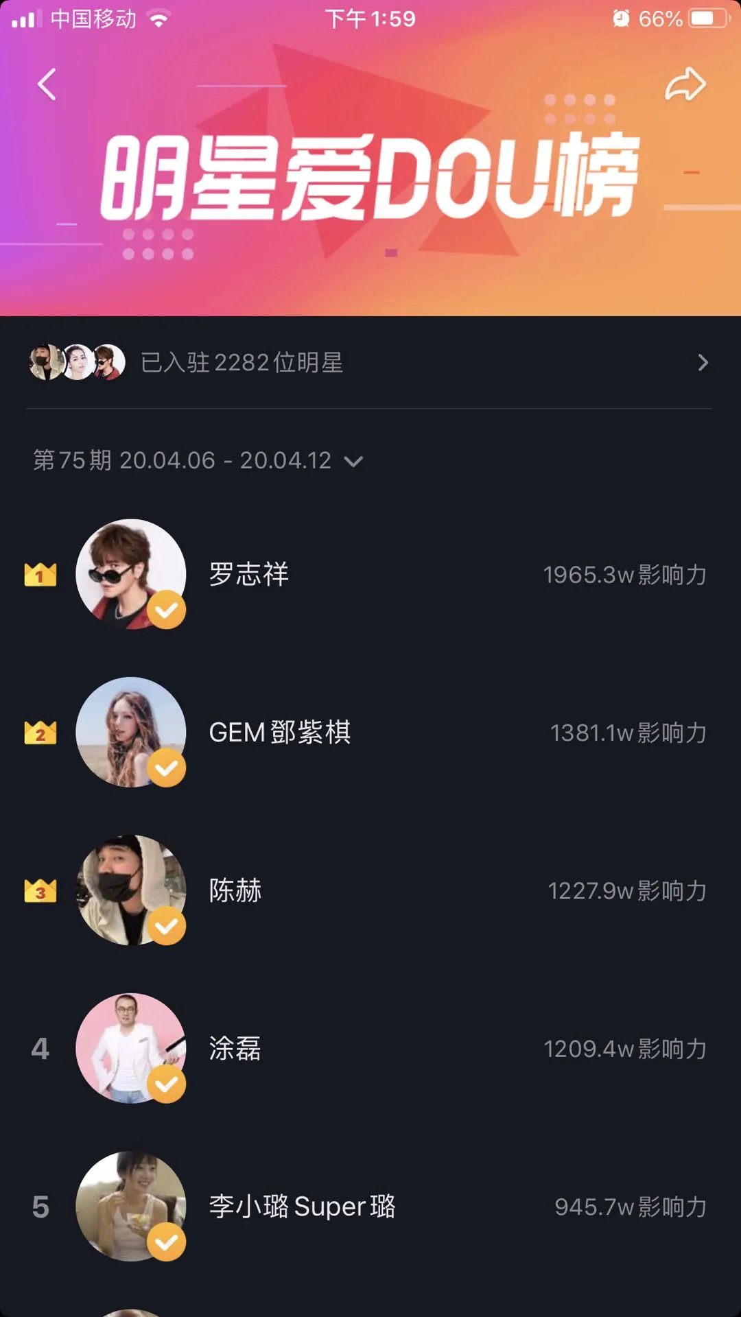 有人说在的抖音的“明星爱抖DU榜”上,一个现象是,铁打的冠军罗志祥,流水的二三名。