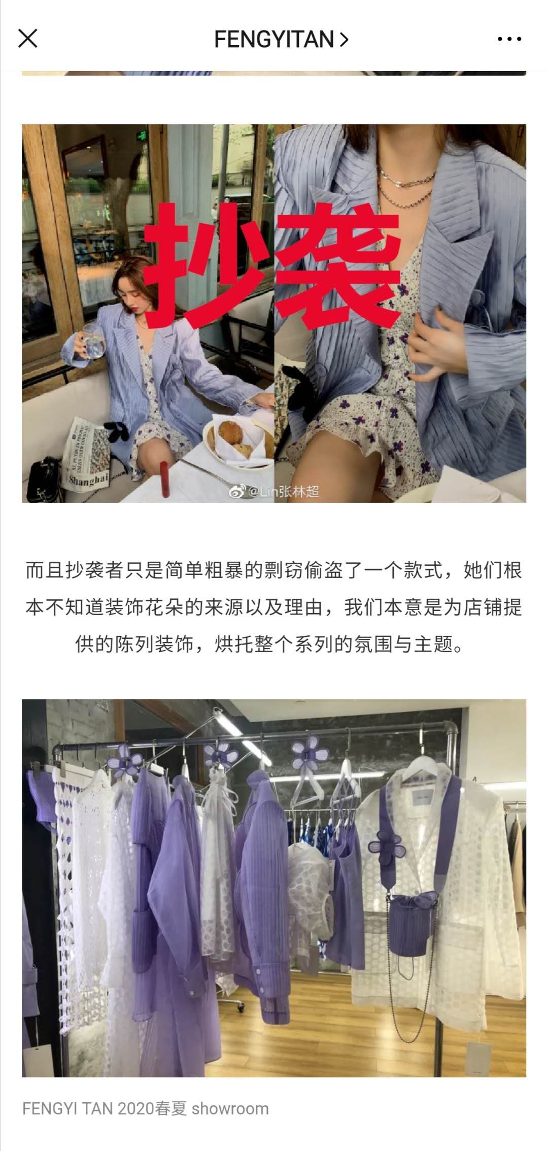 就在4月26日,设计师品牌FENGYITAN在微信公众号发布《无奈!我们被某百万粉丝博主抄袭了!》一文。文中控诉网红“Lin张林超”的淘宝服装店抄袭自己的设计。并提供了对方在宣传中使用了FENGYITAN品牌的产品图。