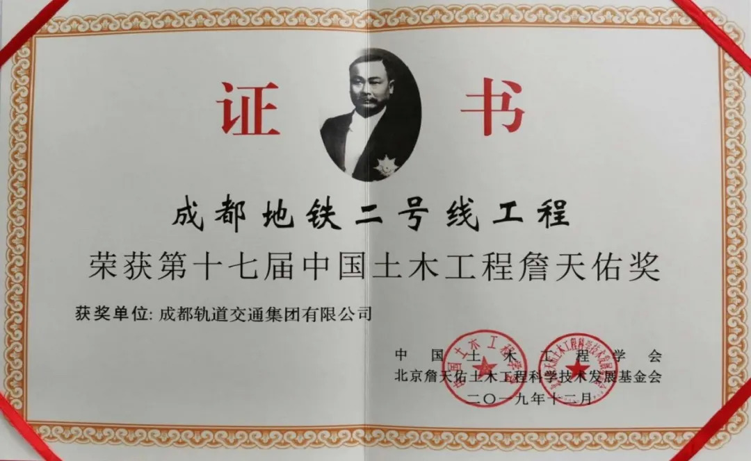 此次地铁2号线工程获得詹天佑大奖只是成都轨道集团长期坚持质量为本、创新发展的一个缩影。
