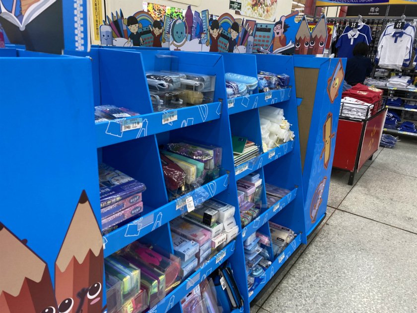 沃尔玛在校服的周边,还搭配展示了书包、文具、鞋袜等配套用品,这似乎正是沃尔玛想要引导的“一站式”购物方式。