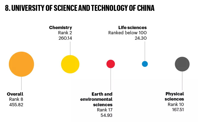 中国科学技术大学位列综合科研实力榜单第 8 名,其中化学领域实力强劲,排名第 2。生命科学领域实力相对较弱,排名 100 开外。