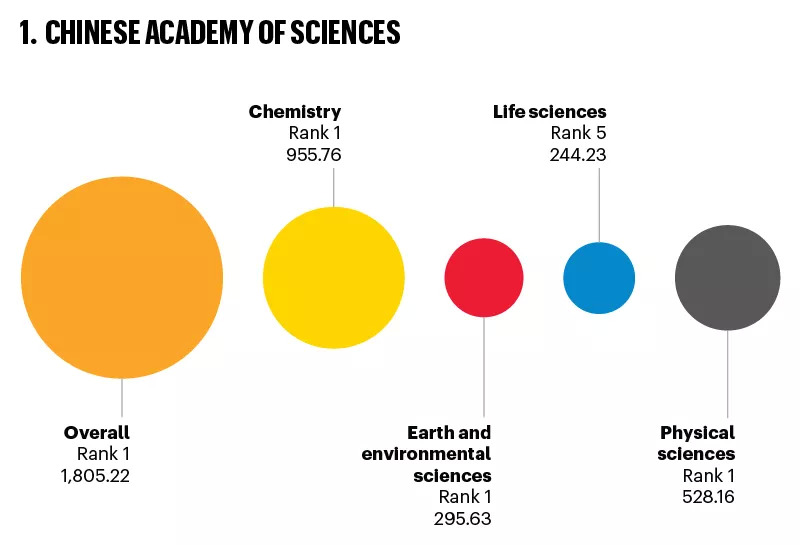 榜单第一名中国科学院,总贡献份额为 1,805.22。就具体学科来看,中科院在化学(955.76)、地球与环境科学(295.63)和物理学科(528.16)领域均排名第 1,在生命科学领域排名略低位居第 5(244.23)。