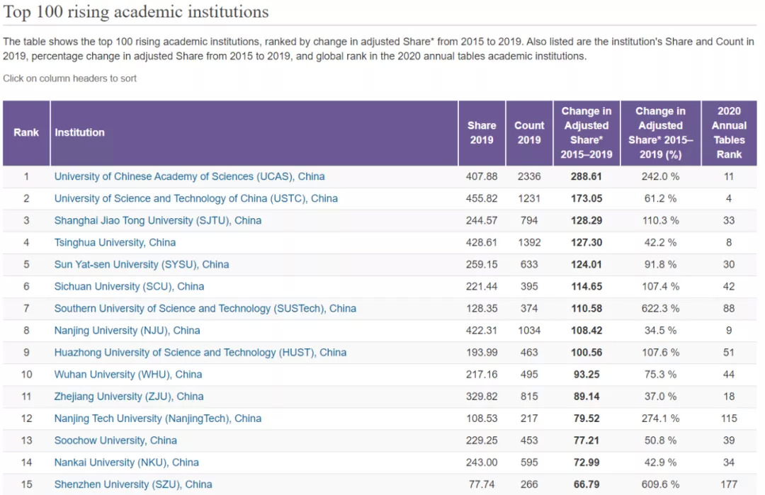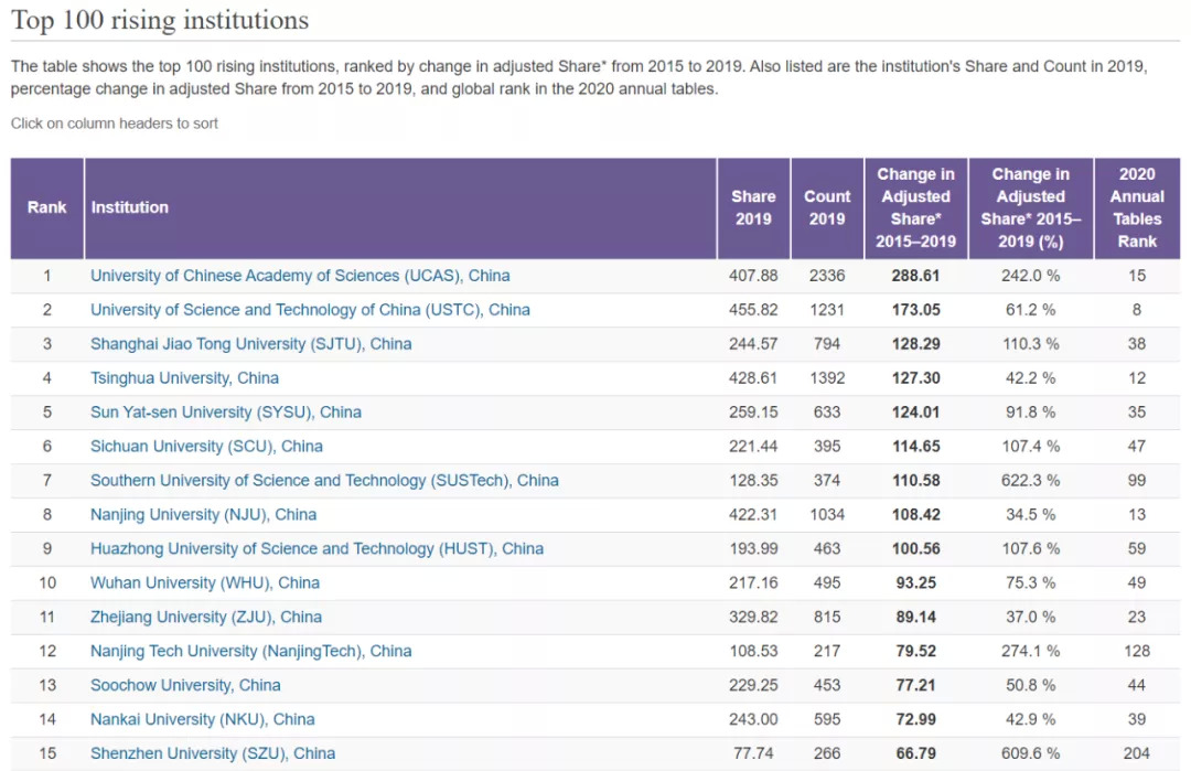 2020 年提升最快学术机构榜单:中科院大学、中科大名列前茅