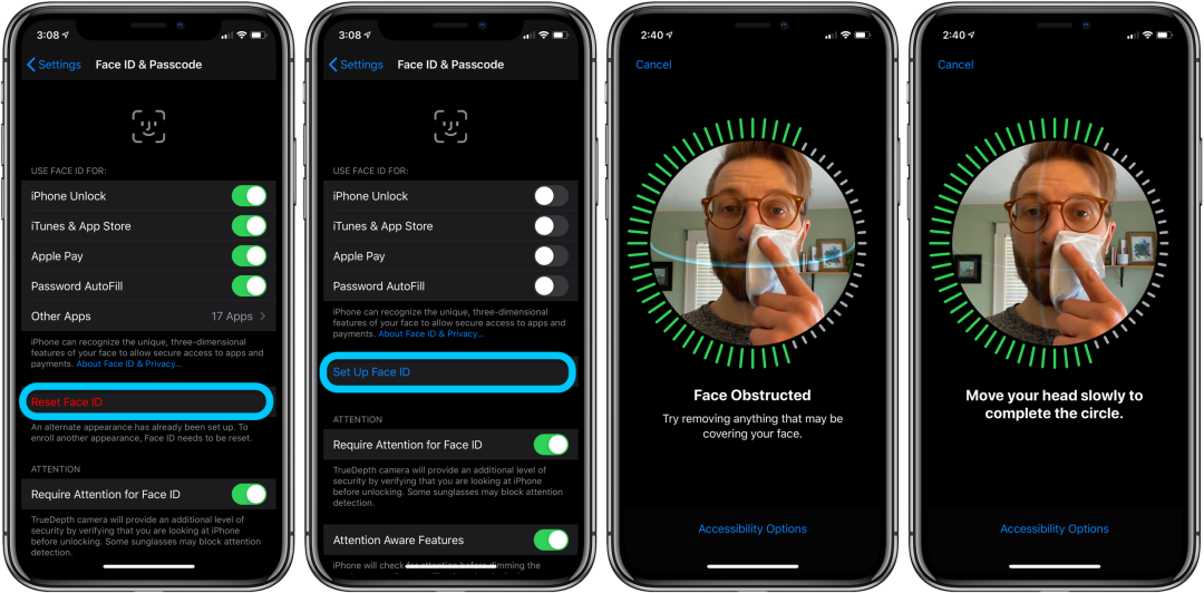 解决办法倒也不是没有,只要锲而不舍地让iPhone不断识别你戴上口罩的脸,iPhone上的机器学习加速器就会自动把这张“脸”变为你的常态面部。毕竟Face ID的最大卖点之一,就是随着你的面部变化,不断地改变识别模型。