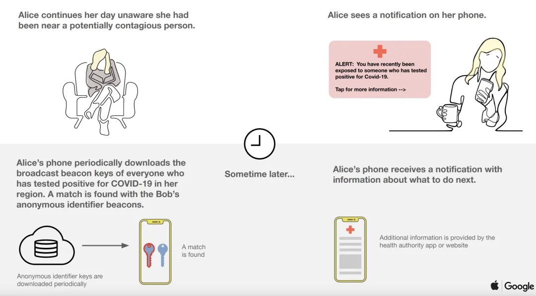 在苹果和谷歌的技术说明中,只要你下载了相关的App,你的手机就会定时向其他用户广播自己的蓝牙地址,同时也会记录其他人的蓝牙地址。如果飞机上的一个用户被确诊后他的蓝牙地址就会被医护人员利用,匹配到其他密切接触者。