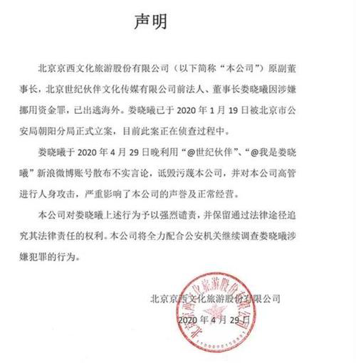 随后,北京文化通过官微回应称:娄晓曦因涉嫌挪用资金罪,已出逃海外,于2020年1月19日被北京市公安局朝阳分局正式立案,此案正在侦查过程中,利用微博账号散布不实言论,诋毁污蔑本公司,严重影响公司声誉和正常经营,将全力配合公安机关继续调查。从微博定位来看,娄晓曦疑似目前身在法国。另外,在爆出“惊雷”之后,北京文化昨日一连发布了几十条公告,更正2019年半年度财报、Q3财报、2018年财报,减去了2018年4.64亿元“重大会计差错”多算的收入,这一金额也似与实名举报信中提到的《大宋宫词》《倩女幽魂》收入刚好吻合。