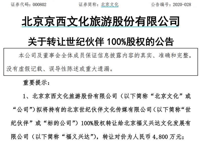 当前因后果被串联起来,一切似乎早有征兆,草蛇灰线,伏笔千里。今年1月30日,北京文化公告称:手握爆款《流浪地球》的2019年预计亏损19.5亿-24.5亿元,上年同期盈利3.26亿元,拟计提商誉减值准备13.7亿-14.7亿元。其中主要涉及到的正是娄晓曦的世纪伙伴商誉减值,这一举动似在为国资新股东入局扫清障碍:2月11日晚,北京文化发布公告称,公司第一大股东华力控股拟将其全部直接持股转让于文科投资,涉及持股比例15.16%。4月29日,北京文化在发布2019年财报和2020年一季报的同时还发布了一则《关于转让世纪伙伴100%股权的公告》,以4800万价格出售13.5亿买入的世纪伙伴,这一行为正是引发当日晚上娄晓曦举报的“导火索”。