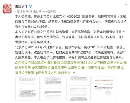 原副董事长娄晓曦通过北京文化子公司@世纪伙伴 官方认证微博,公开向证监会举报北京文化系统性财务造假,董事长宋歌与公司副总裁张玉龙涉嫌“损害上市公司利益罪,欺诈发行债券罪,违规披露、不披露重要信息罪,职务侵占罪”,具体包括四宗罪:一、挪用上市公司资金业绩造假,包括《横店故事》《大宋宫词》《倩女幽魂》等;二、挪用上市公司资金帮助子公司摩天轮影视文化传媒完成业绩对赌;三、为离职高管套现股票挪用资金;四、职务侵占,借高于市场价的公司场地租金为家人牟利。有评论称之为现实版“猎狐”“我是余欢水第二季”。该微博附上了证监会的回函,日期为3月19日。
