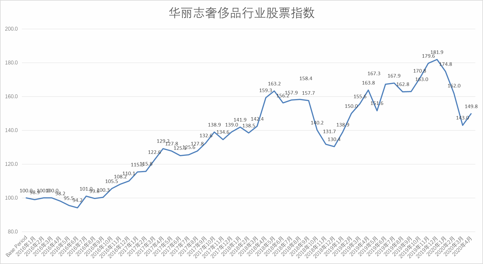 从2016年起,《华丽志》推出“华丽志奢侈品行业股票指数”,截止2020年4月底的全球奢侈品行业股票走势如下图所示。