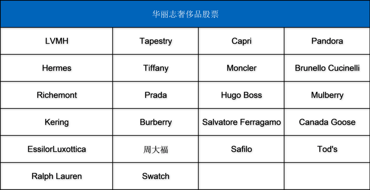 “华丽志奢侈品行业股票指数”基于《华丽志》选出的全球22只最具代表性的奢侈品股票(如下图),采用了“市值加权法”——给市值较大的股票以较高权重,给市值较小的股票较低权重。计算的具体方法是把指数中的每只股票的市值(股价×总股本)加起来,先除以基期的总市值,再乘以基期的指数值,基期的指数值设为 100,基期是2016年1月1日。为排除汇率波动的影响,各月均采用基期汇率。
