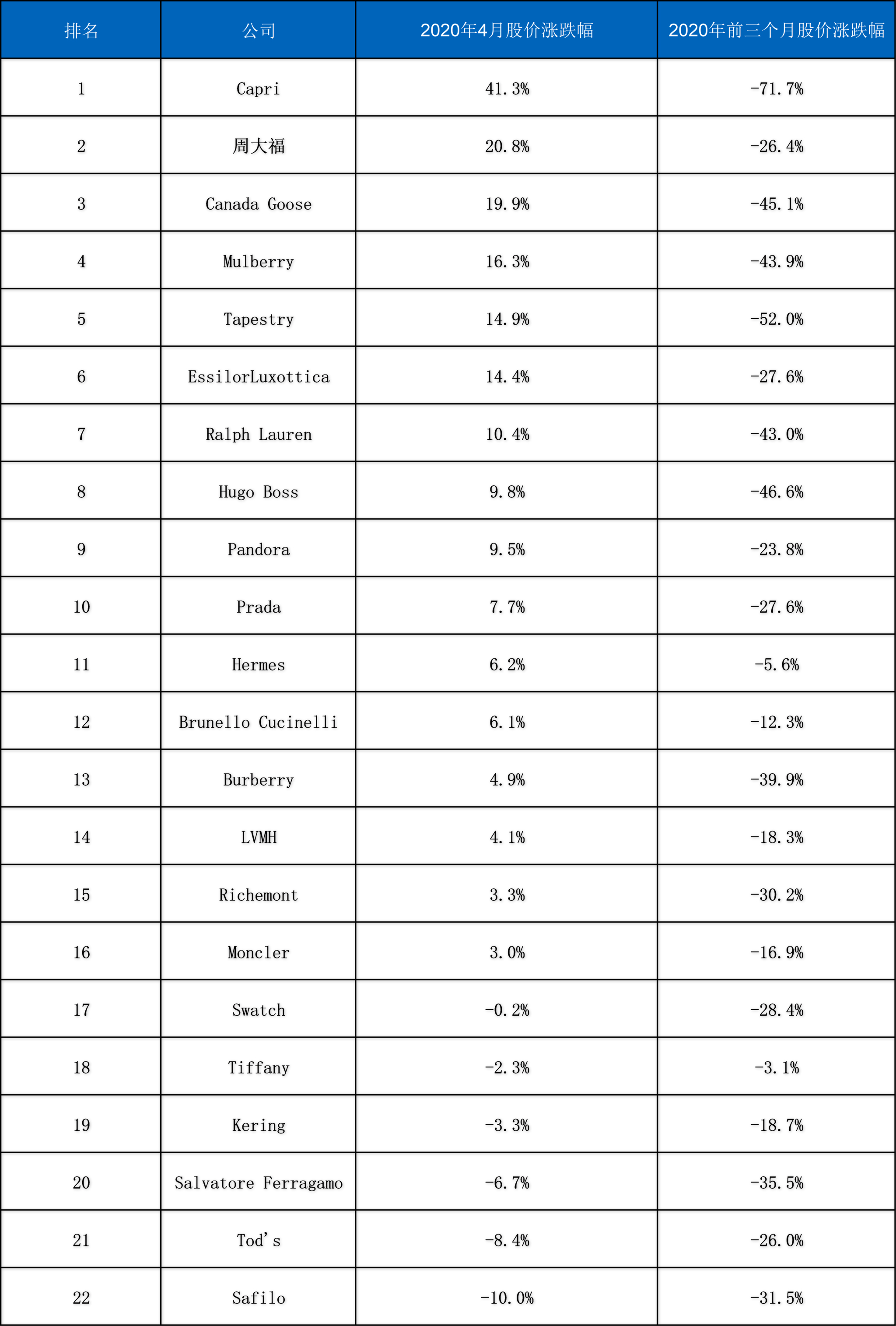 2020年4月跌幅最大的3只奢侈品股票具体分析如下: