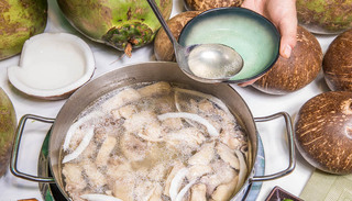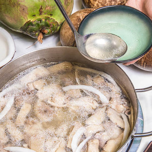 李会革的烟塘椰子鸡汤则要早起步一点。2014年时他做的椰子鸡汤预包装产品就已经卖到岛外,让各地网友在家就能吃上那碗心心念念的海南味道。现在,每年有两万多只烟塘椰子鸡搭上冷链物流运输车送至全国各省市。