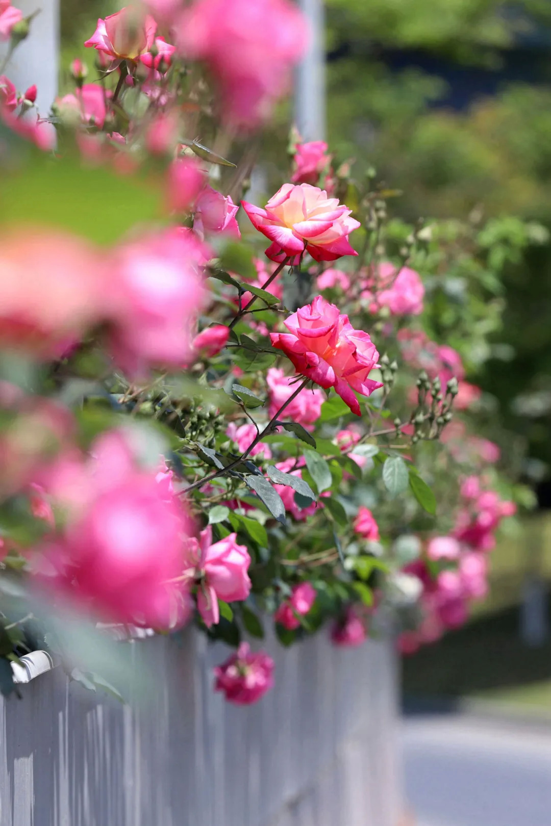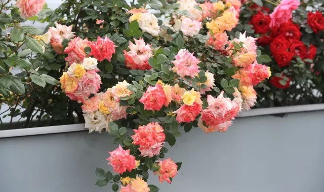 “空中花廊”品种多为月季,有橘黄相间的红从蓉和黄从蓉、花团锦簇的粉色“安吉拉”、鲜红亮丽的中国红、清秀典雅的粉花“仙境”、小家碧玉的西瓜红、更有绚丽多彩的大花月季,花型丰富、花量多。