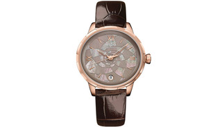 表盘:棕色珍珠贝母表盘,花淅系列专属图案花纹刻饰,同色调珠光盘圈,PVD镀玫瑰金不锈钢罗马数字刻度,日期窗位于6点钟位置。