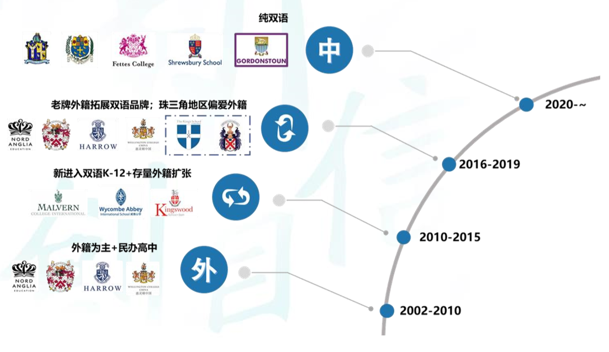英式新品牌和老品牌在这一时期动作明显。比如, 2013年惠灵顿公学落户上海浦东;哈罗公学则先后在9座城市建成或在建11所学校;老牌外籍子女学校德威则设立双语子品牌德闳,以覆盖本地生源。其中,惠灵顿公学是上海陆家嘴集团引进,上海哈罗则由上海外高桥集团推进合作。