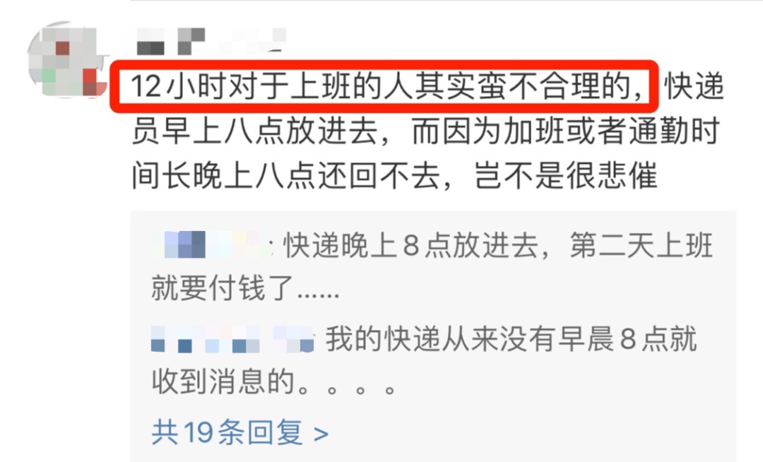 “在12小时内取快递根本就不现实,快递早上八点放进去,因为加班或者通勤时间长晚上八点回不去,岂不是很悲催。”