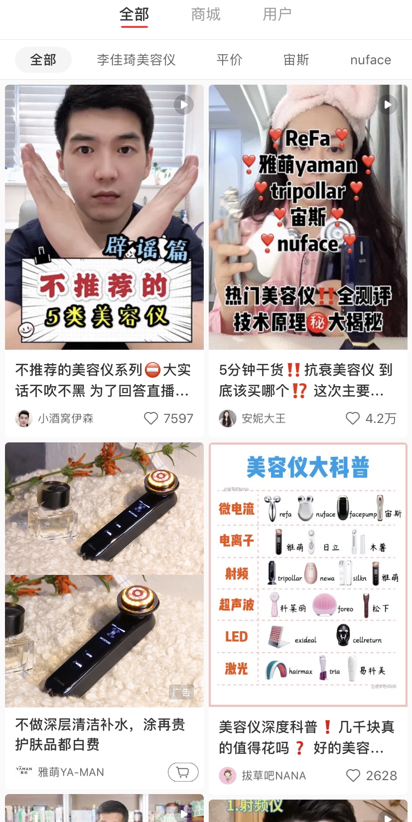 在国内,几乎所有美容仪都是先通过社交媒体让消费者认识自己。在生活方式平台小红书上,与“美容仪”有关的笔记已超过17万篇,国内美容仪品牌“木薯”创始人曾在接受界面新闻采访时表示,国内80%的美容仪都是在靠网红推广。