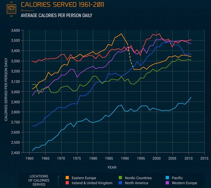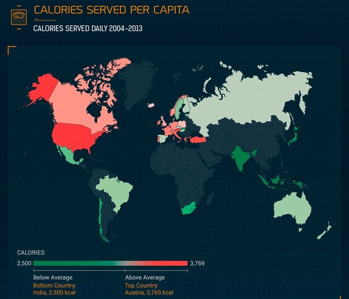 从下图可以看出,2004年到2013年间北美及欧洲大部分地区摄入的热量远远超过世界平均值。