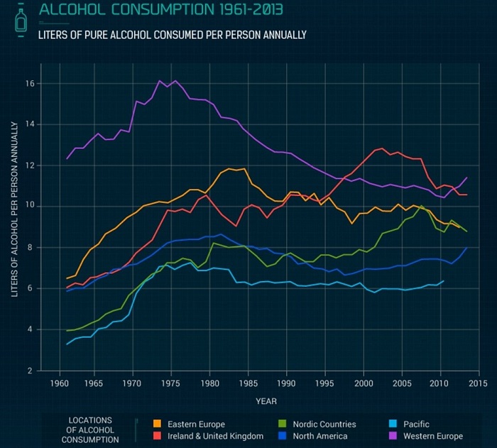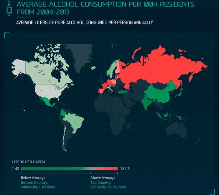 致力于治疗上瘾症的Recovery Brands公司为我们提供了一组信息图,这些图利用经济合作与发展组织(the Organisation for Economic Co-operation and Development)提供的数据进一步分析了世界各国热量、酒精和烟草的摄取量。