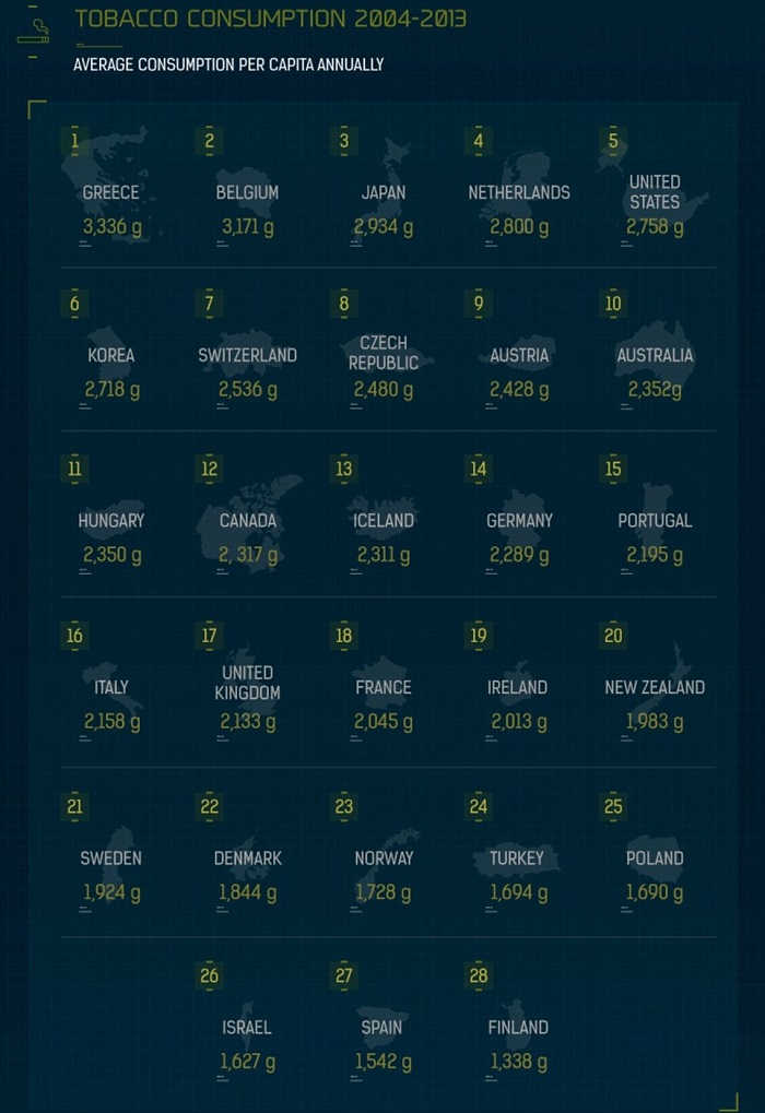除了印度尼西亚,男性吸烟比例较高的国家还包括拉脱维亚、中国、俄罗斯和希腊。希腊15岁以上的吸烟者中,40%每天平均抽掉9支香烟。比利时、日本、瑞典、美国紧随其后。