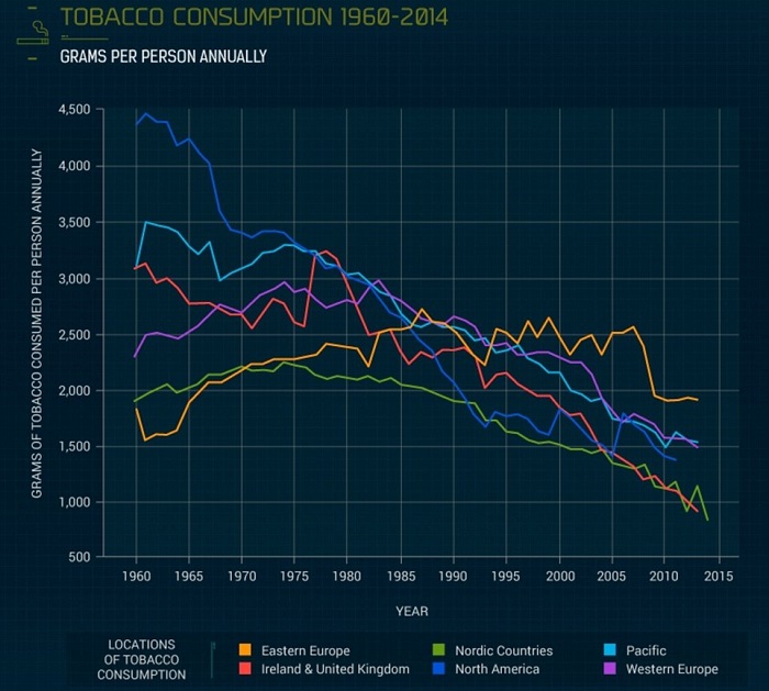 冰岛是唯一一个女性吸烟者多于男性吸烟者的国家,但整体吸烟比例却处在富裕国家中最低水平。