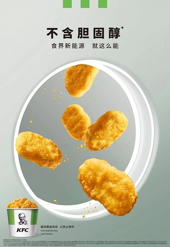 4月20日,肯德基正式宣布在国内公测“植培黄金鸡块”,原材料为“植物肉”,主要成分为大豆蛋白、小麦蛋白和豌豆蛋白,公测阶段的售价为1.99元/5块,预订成功的消费者可在上海、广州和深圳三地特定的肯德基餐厅购买到。