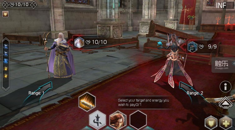 游戏中选择攻击对象时的界面。屏幕底端是主角所拥有的技能和魂石,左方则是包含两种不同法力球的资源栏