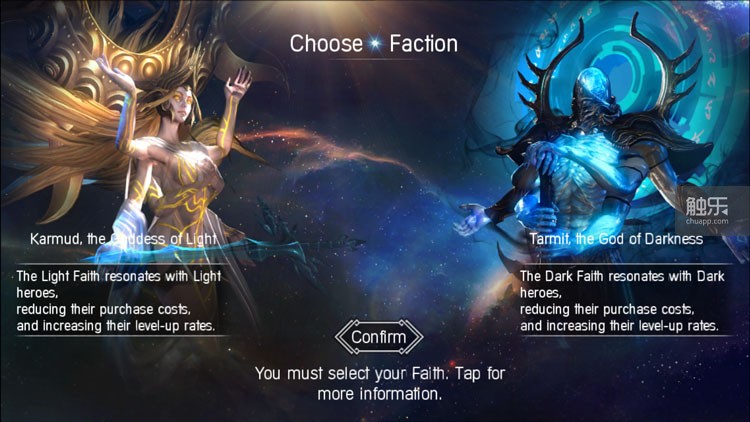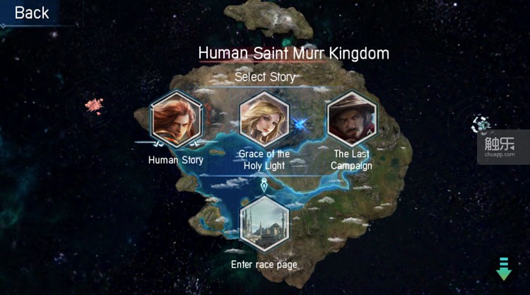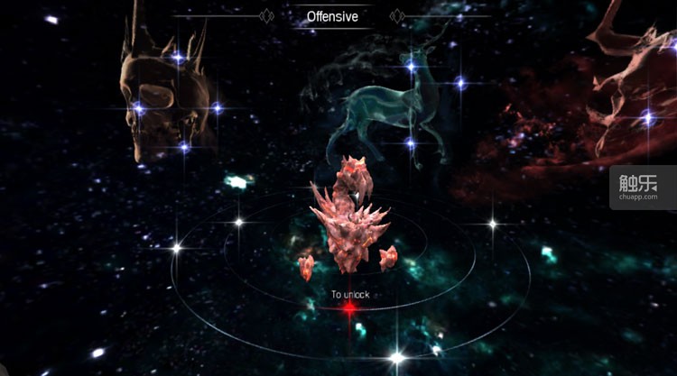 或许是开发者希望充分展现虚幻3引擎的效果,主界面完全采用了3D化的风格。破碎的“神之遗迹”大陆漂浮在一片星海之中,四周是代表着所有种族的星座,玩家可以360度地拖动它,并且通过不同的星座查看游戏中的角色。当玩家点击大陆时,画面变化为俯瞰视角,玩家可以选择不同种族的故事任务。而在对战界面中,玩家通过圆盘的转动来选择不同的对战模式。“有人说还是改成2D的列表比较好。但我觉得2D列表没什么意思。”刘希这样说道。