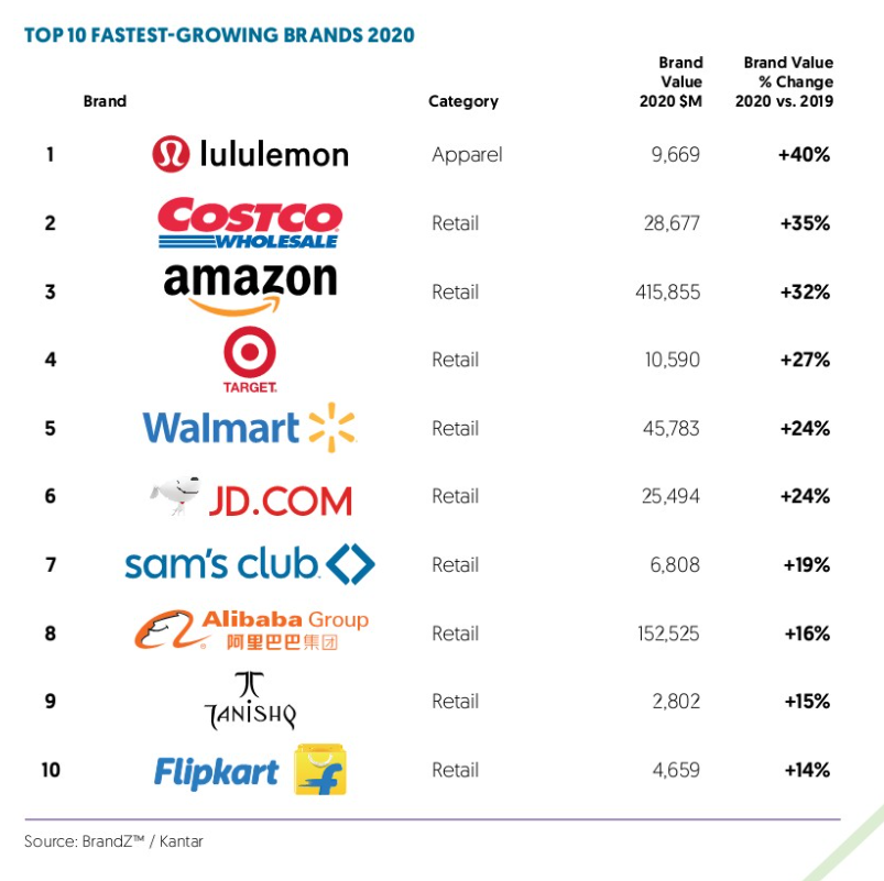 2020年 BrandZ 零售品牌价值排行榜总结的主要市场趋势如下: