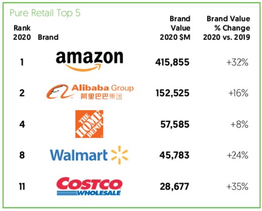纯零售类品牌价值排名前五的品牌依次是:Amazon (亚马逊),阿里巴巴,The Home Depot(家得宝), Walmart (沃尔玛)和 Costco (好市多)。以上品牌的价值均获得了不同程度的增长。