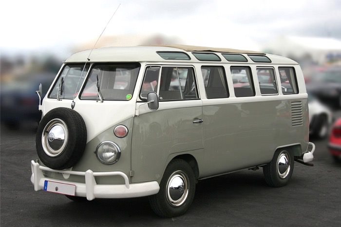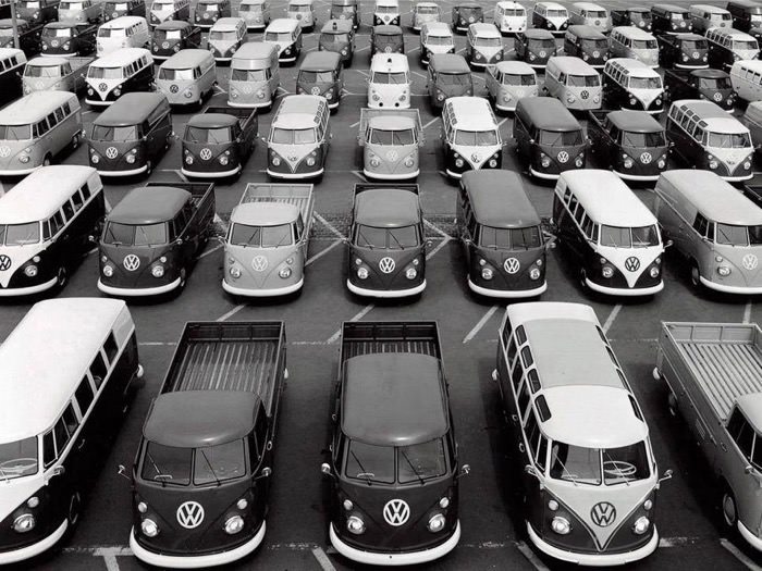 11. 从1949年到1967年,大众一直在生产这种“分屏式”车型(split screens)。所谓“分屏”得名于该车型的分体式挡风玻璃以及标志性的“V字形”前脸。它们搭载一种后置风冷发动机,其设计简单,但性能相当可靠。从参数来看,该发动机的排量为1131立方厘米,转速3300/分时,功率则为18千瓦。在印度尼西亚,T1也被称为“大众达科塔”(Dakota,得名于二战末期的英国DC3 Dakota运输机,该机型拥有类似的分体式机舱玻璃)或者“大众Cancut”,后者是一种从正面看呈V字形的女式内裤。
