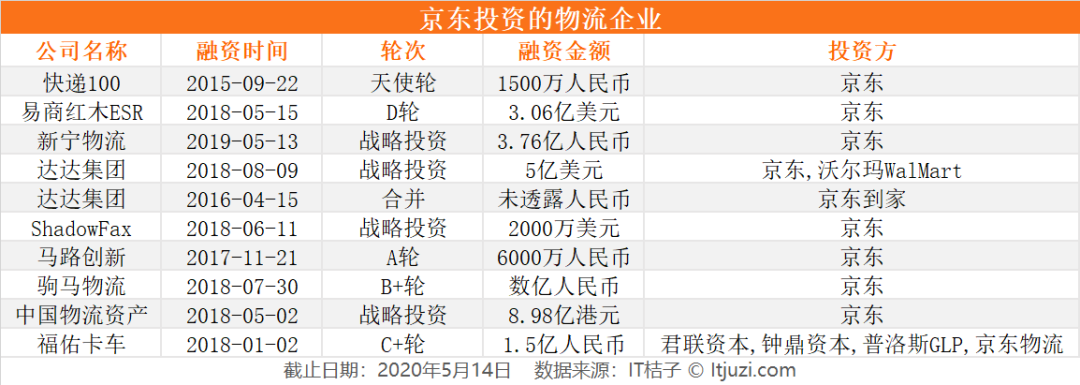 除了依靠自身力量组建京东物流之外,京东也通过投融资、并购等方式巩固物流城池。IT 桔子数据显示,截止 2020 年 5 月 14 日,仅公开事件中,京东共计参与 10 起物流领域的投融资、并购。