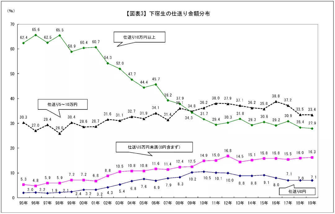 因为经济不景气,日本父母给予孩子上学的援助,从1994年的12.49万日元,锐减到2016年的8.57万日元。