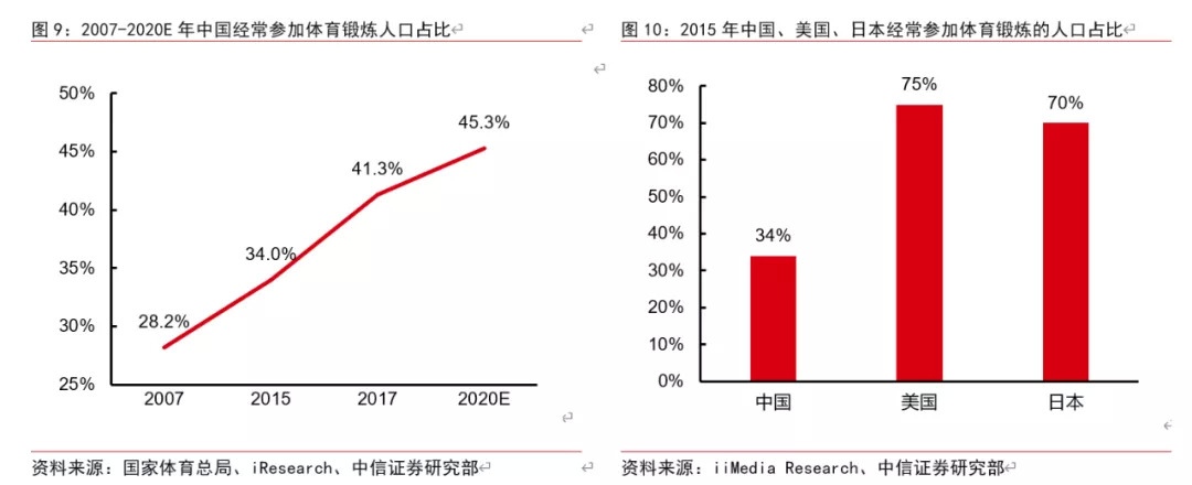 一方面是体育人口比例的增加。中国现在的体育人口比例已经达到了40%多,但和发达国家相比,其实还有很大的差距,欧美基本上已经达到了60% -70%多的水平。