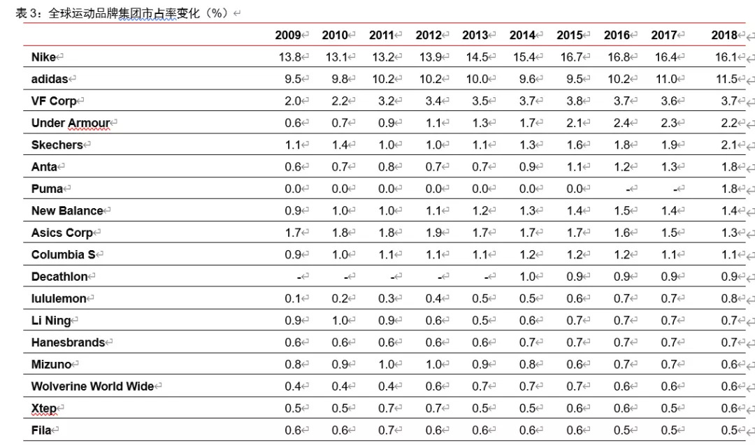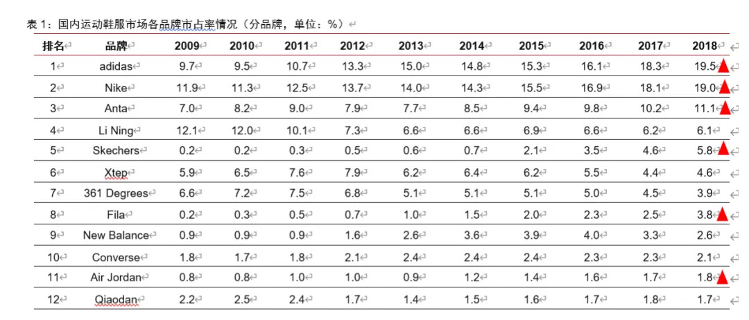 以上简单介绍了国内运动鞋服市场的发展过程,包括竞争的格局、不同品牌市场份额的演变。