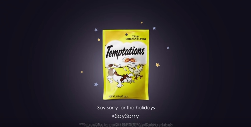 这其实是宠物食品品牌Temptations找英国Adam&EveDDB广告公司拍摄的广告,表现出猫咪们为了配合主人过节的各种不情愿。他们甚至还在网络上发起了一项名为“对你的猫说抱歉”的活动。当然,广告的最终目的还是为了卖产品,看猫咪们为了配合都委屈成这样了,愚蠢的人类还不来一包鸡肉味的Temptations猫粮贡献给猫大人?