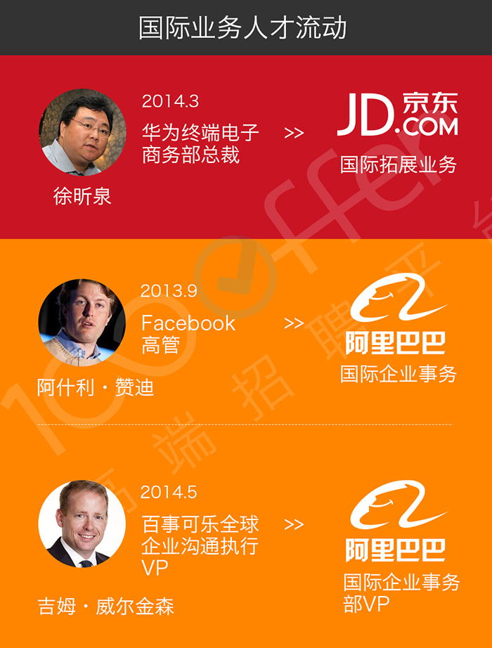 在2014年IPO前,两家电商巨头都陆续爆出国际业务领域高管任命的新闻。京东请来了为华为打下俄罗斯和欧洲市场的老将徐昕泉,阿里先后重金聘请了Facebook和百事可乐的全球高管,在为IPO背书的同时也为未来国际市场的竞争谋划布局。