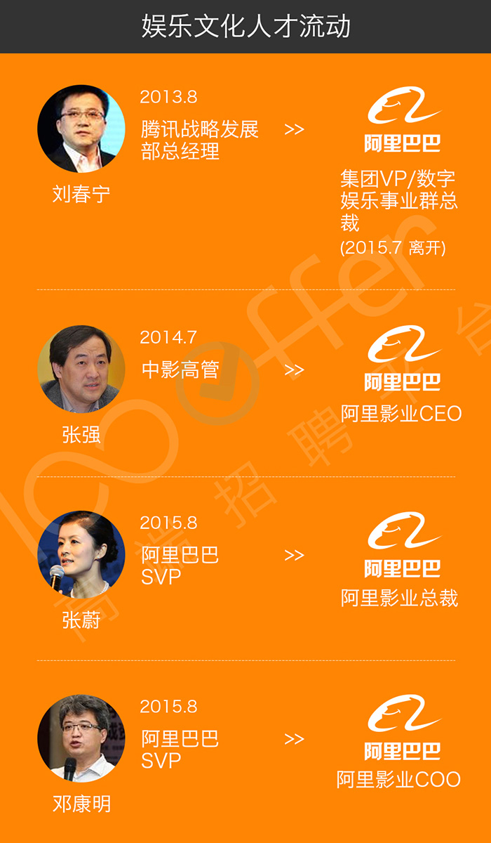 阿里巴巴的电商帝国之触手伸得更远,从2013年底挖来腾讯刘春宁开始,倾斜资源发展数字娱乐事业,并开始大规模进行视频、手游、音乐、电子书等部门招聘。在高层方面,阿里一边吸纳传统娱乐行业人才负责内容研发制作,一边配以具备互联网经验的高层支持,进行娱乐转型。