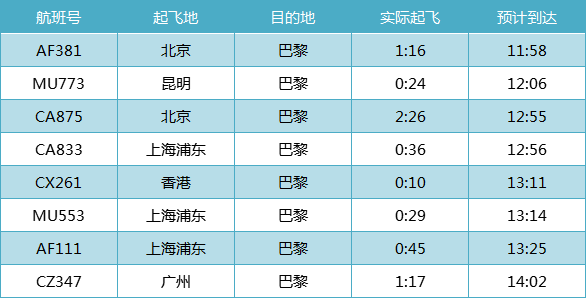 此外,为进一步了解起飞往巴黎航班情况,您可以登陆国航,东航,南航,法航,国泰航空公司的官网或官方微博,进一步了解航班情况。