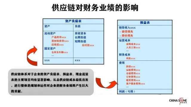 资产负债表、损益表和现金流量表是公司经营经常使用的三张表,供应链环节对这三张表的主要项目均有显著影响,从总供应链成本最优出发,进行整体的规划和运作对企业的财务业绩将产生巨大的贡献。