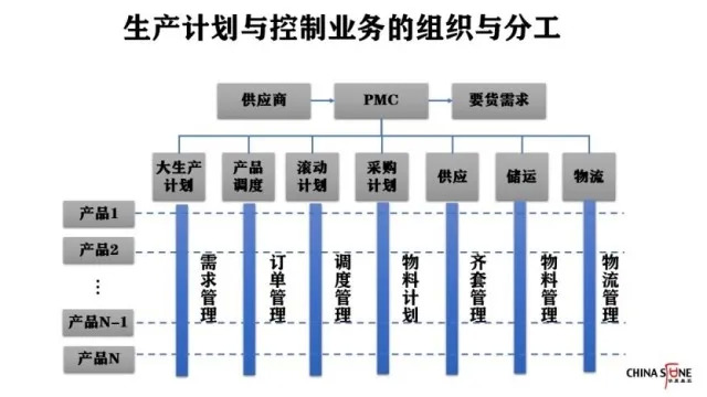 在上图中,我们对生产计划与控制业务组织做了简单的分工。假设一个公司有N种产品,不同的部门对应不同的任务,大生产计划主要负责需求管理,产品调度负责订单管理,滚动计划负责调度管理,采购计划负责物料计划,供应负责齐套管理,储运负责物料管理,物流负责物流管理。