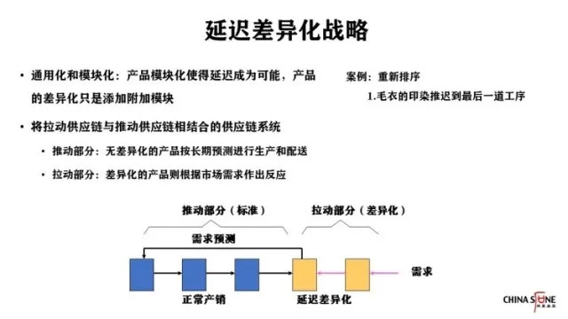 现代工业产品大部分都由功能和特性组成,可以通过组合零部件形成特殊功能。当你把一个产品打开以后,就会发现它有很多通用的模块。产品模块化使得延迟成为可能,产品的差异化只是添加附加模块。在这个过程中间,延迟差异化战略要推动建立大量标准部分,无差异化的产品按长期预测进行生产和配送,差异化产品要根据市场需求作出反应。