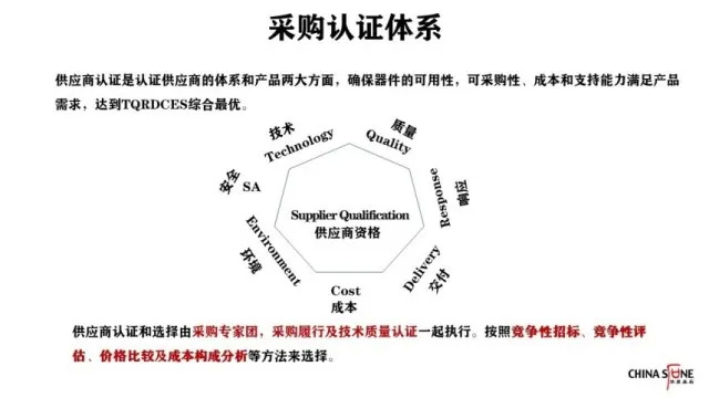 在采购认证体系中,供应商的支持非常重要。好的供应商能确保器件的可用性、可采购性、成本和支持能力满足产品需求,达到TQRDCES综合最优。可以从七个维度来考虑供应商的支持,分别是安全、技术、质量、响应、交付、成本、环境。供应商的认证和选择由采购专家团、采购履行及技术质量认证一起执行,按照竞争性招标、竞争性评估、价格比较及成本构成分析等方法来选择。