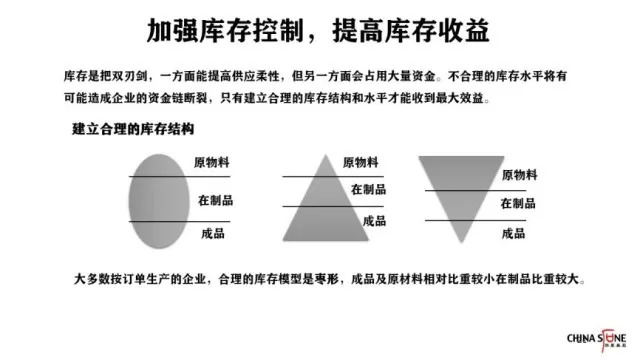 在这里给大家推荐一种库存模型——枣形,也可以称之为椭圆形,原材料和成品分布在两端,在制品在中间。这种模型相对灵活,产能柔性很好,不会有大量的产品库存呆滞。另外还有两种库存模型:一种是三角形,成品特别多,导致库存占用很大;另一种是倒三角形,原材料占用很大,大量的资金投入在原材料上,但原材料无法变现,变成成品后才能变现。