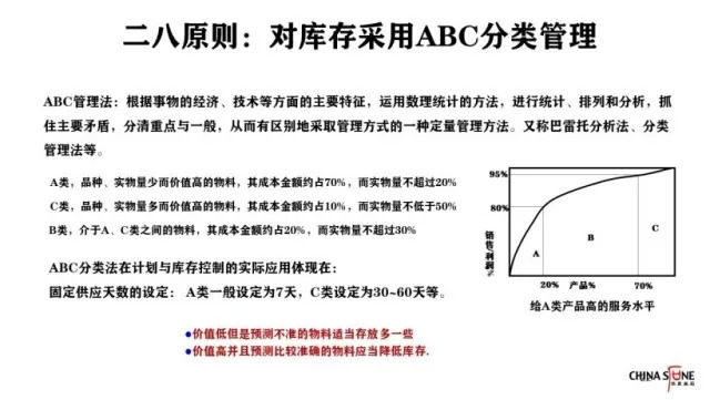 二八原则,又可以称之为ABC管理方法。即根据事物的经济、技术等方面的主要特征,运用数理统计的方法,进行统计、排列和分析,抓住主要矛盾,分清重点与一般,从而有区别地采取管理方式的一种定量管理方法,又称巴累托分析法、分析管理法等。比如A类产品的特征是实物量少而价值高,其成本金额约占70%,而实物量不超过20%;C类产品的特征是实物量多而价值高,其成本金额约占10%,而实物量不低于50%;B类产品介于这两类之间。针对这三种不同种类的库存,A类产品的供应天数一般为7天,C类产品的供应天数一般是30-60天,B类产品介于这两类之间。总的来说就是,价值低但是预测不准的物料,可以适当多存放一些;价值高并且预测比较准确的物料,应当降低库存。