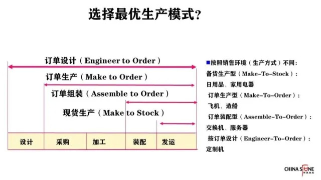 传统的生产和制造都会经过设计、采购、加工、装配、发运五个环节,主要有四种生产模型。