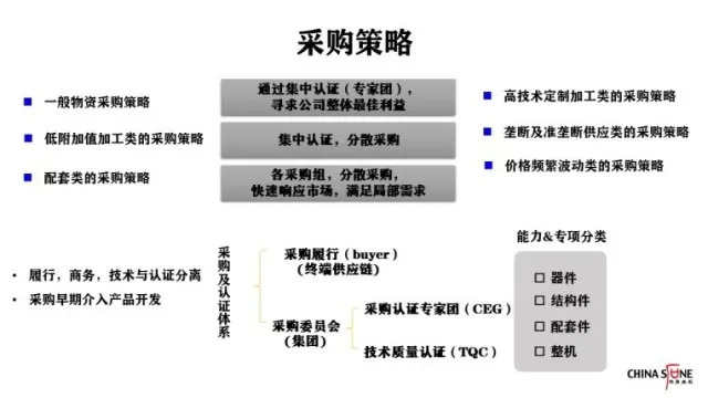 采购一定要早早地介入产品开发,而不能等产品生产了一半,马上就需要这个东西时,才去采购。在采购及认证体系中,可以把采购履行单独成立一个部门,然后把采购认证专家团和技术质量认证放在采购委员会中。相对来说,采购认证及认证体系有上层能力,可以把履行部分分离出来,由另外一个部门负责。在采购委员会中,把能力和专项分类,按照器件、结构件、配套件、整机来做分割。