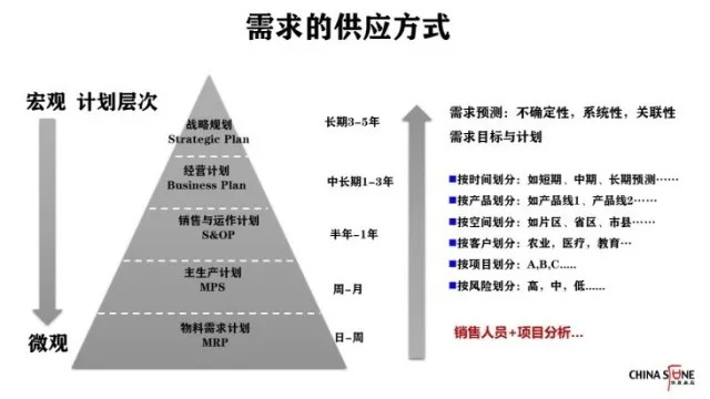 需求的供应方式可以从宏观到微观、长周期到短周期来进行管理。所以,宏观到微观的计划层次,会从战略上做规划。整个供应之所以是战略指导下的供应,是因为公司的战略一定会在供应策略上呈现出来。企业发展要快还是要全球化,这些都需要在战略策略上进行规划。