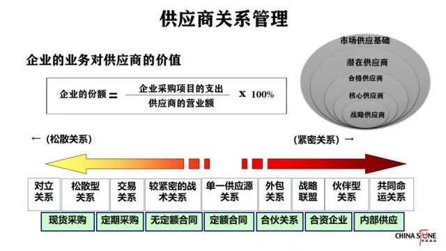 一个企业作为另外一个企业的长期供应商,但是供应关系并没有随着时间变长而逐渐加深,原因是企业的业务对供应商产生的价值不大。企业的份额=企业采购项目的支出/供应商的营业额*100%,如果供应商有80%的订单来自于你这个企业,你对供应商就相当重要,因为供应商主要是为你服务。在这种情况下,企业和供应商就会往战略联盟、伙伴、命运共同体方向发展。