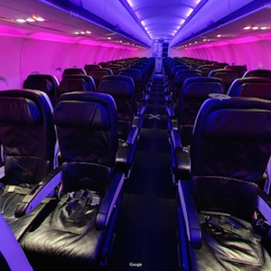 当然,之所以敢将“360度浏览机舱内部”作为卖点,维珍美国旗下的航班质量自然不敢逊色。从图中就可以看到,皮质座椅和紫粉色的舱内光线让狭窄的空间不再显得那么沉闷,再调近焦距,还能看到每一张座椅背后的充电插座、无线标志以及游戏屏幕。